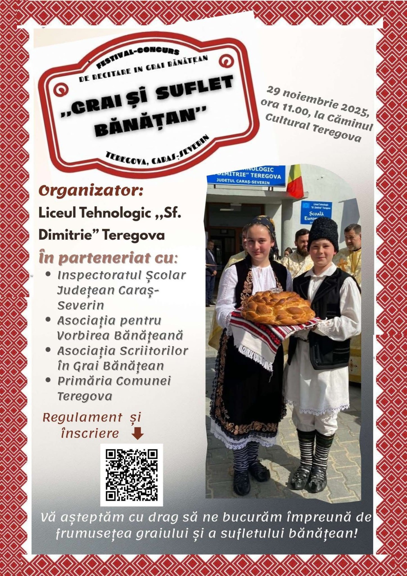 Cu dorința de a promova și conserva graiul bănățean, Liceul Tehnologic „Sf. Dimitrie” Teregova organizează prima ediție a Festivalului-concurs de recitare în grai bănățean „Grai șî suflet bănățan”. Evenimentul se va desfășura sâmbătă, 29 noiembrie 2025, începând cu ora 11, la Căminul Cultural Teregova.