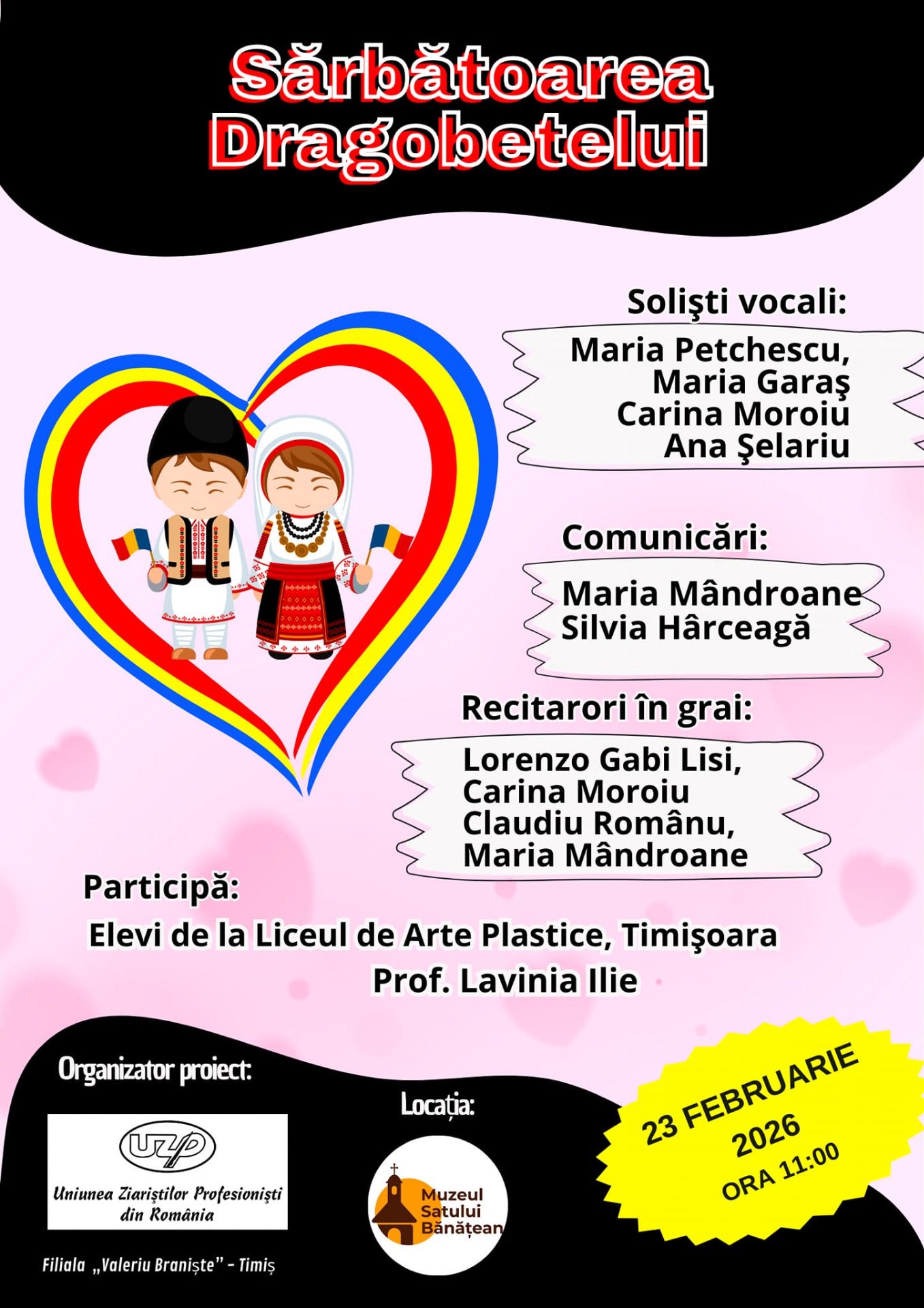 Luni, 23 februarie, ora 11:00, Uniunea Ziariștilor Profesioniști din România – Filiala „Valeriu Braniște” Timiș, în parteneriat cu Muzeul Satului Bănățean din Timișoara, vă invită să celebrăm împreună Sărbătoarea Dragobetelui – tradiția românească a iubirii și a primăverii.