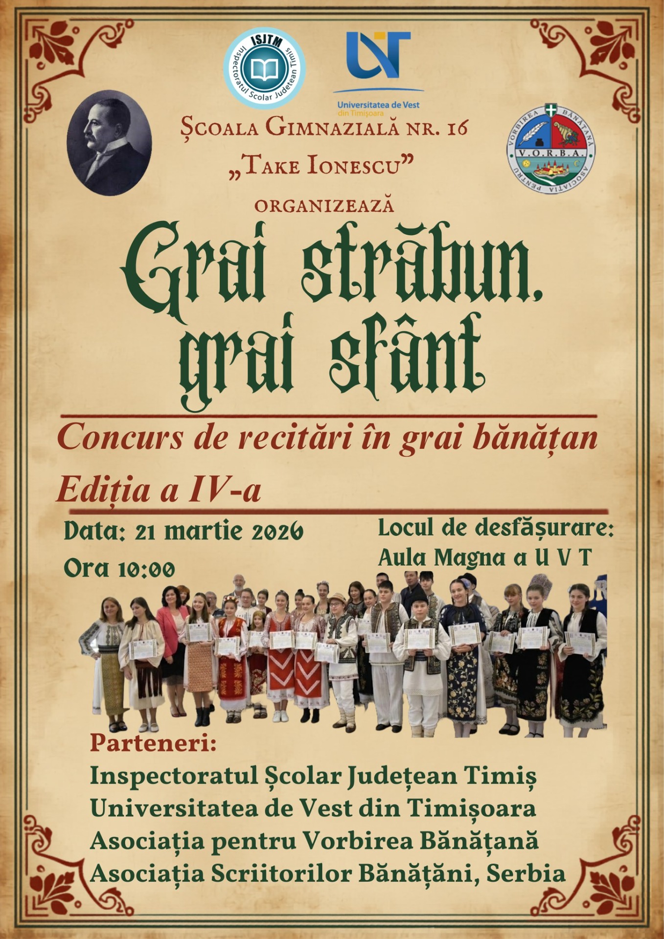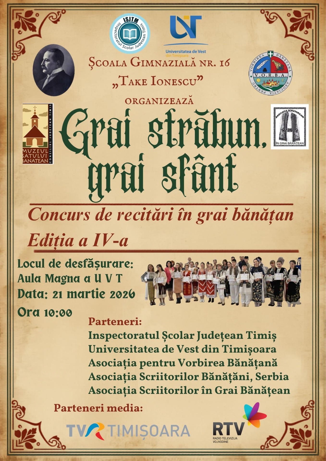 Glasul Banatului va răsuna din nou în Aula Magna a Universității de Vest din Timișoara (UVT), care va găzdui, în data de 21 martie 2026, de la ora 10:00, cea de-a patra ediție a concursului de recitări în grai bănățan „Grai străbun, grai sfânt”, organizat de Școala Gimnazială Nr. 16 „Take Ionescu”.